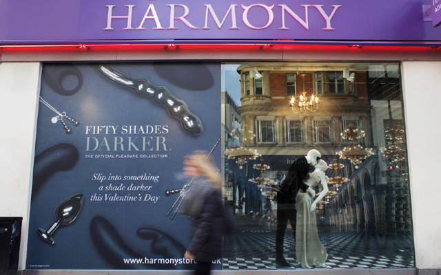 Harmony’s Oxford Street branch has opted for a Fifty Shades Darker window display for Valentine’s Day and the firm is already reporting an increase in footfall since it was installed. Entitled Masquerade Ball, the main image depicts two mysterious figures dancing by the light of a chandelier and is reminiscent of scenes from the soon-to-be-released Fifty Shades Darker movie.