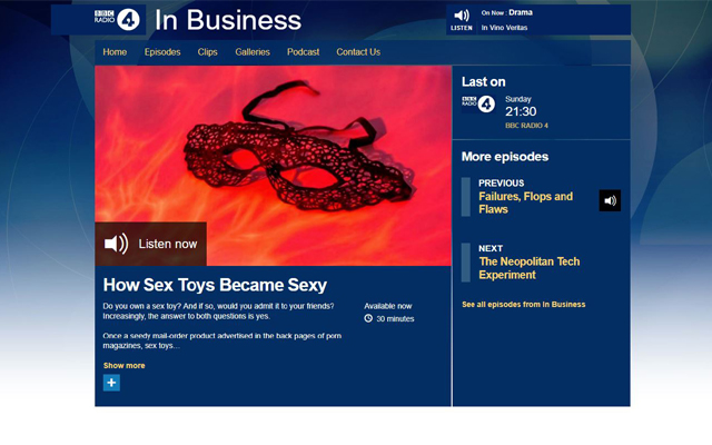 Doc Johnson’s Chad and Erica Braverman were featured on BBC Radio 4’s In Business programme last week last week, in an episode titled How Sex Toys Became Sexy, presented by journalist Laurence Knight. In Business is a half-hour documentary series about the world of work and Knight’s interview with Chad and Erica focused on the business of sex toys. The segment aired live on Thursday 6th September and was also broadcast again on Sunday 9th September. You can listen to the full interview on BBC iPlayer (for a limited period – registration required) with the Doc Johnson segment starting at 7:09 minutes into the recording).