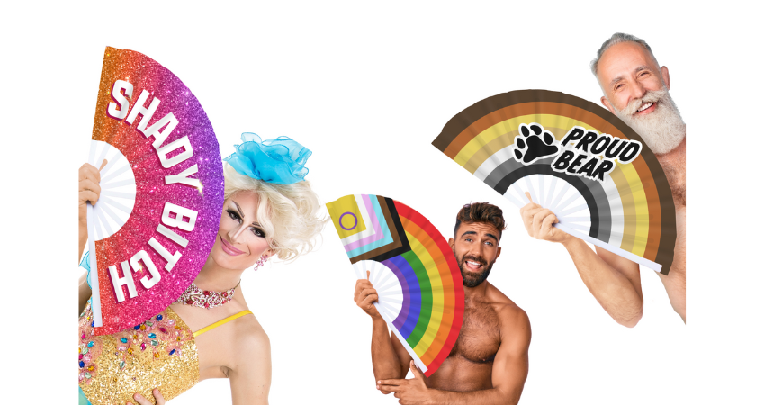 The collection includes the Progress and Bear Pride flags, and the fans combine robust construction with bold visuals and playful slogans.