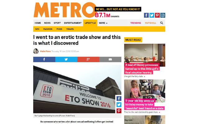 Metro was launched in March 1999 as a free, colour newspaper for London’s morning commuters and it is now available in 50 UK cities. With a circulation of some 1.3 million copies, Metro claims to be the world’s largest free newspaper and the third biggest newspaper in the UK. The full piece by Violet Fenn can be found at: http://metro.co.uk/2016/06/16/hold-for-more-info-i-went-to-an-erotic-trade-show-and-this-is-what-i-discovered-5938853/