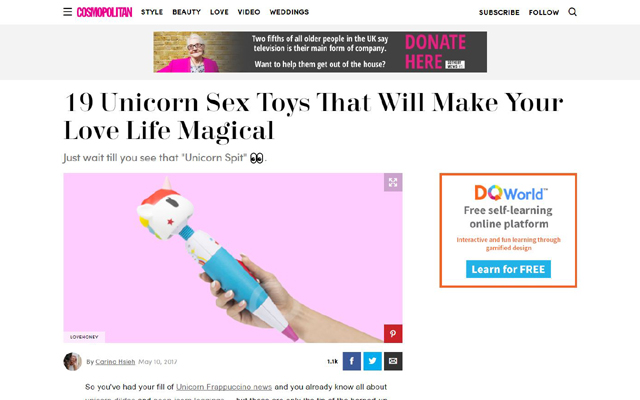 The Tokidoki X Lovehoney Unicorn Wand has been featured on major US website Cosmopolitan.com, which is visited by almost 22 million unique users a month. The feature, headlined ‘19 Unicorn Sex Toys That Will Make Your Love Life Magical’ also includes the Unicorn Bullet Vibe from the same range, along with other unicorn-themed toys and accessories.