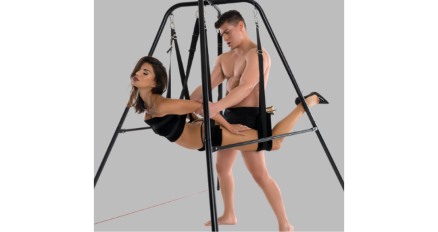Then there’s the Lovers Swing with Stand, a freestanding steel frame that doesn’t require a ceiling attachment and offers full stability, padded body supports, and adjustable straps.
