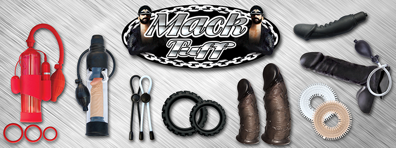 The Mack Tuff collection of toys and gear for men includes two penis pumps, a traditional pump and one that vibrates, as well as realistically shaped penis extenders, a vibrating inflatable dong, ribbed cockrings, adjustable cock ties made of high-end silicone, truck tire shaped cockrings, and the Ribbed Vibrating Silicone Penis.