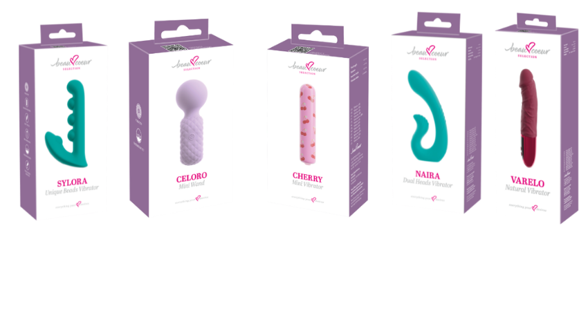 Orion Wholesale explains that the Beau Coeur collection “stands for diversity and inspiration, and it appeals to a large target audience: adults who are open to new adventures, regardless of experience or preferences”. It also features a new packaging concept: the base of the artwork is white, but coloured panels on the side of the boxes show which category a toy is in. Essentially, every pleasure has its own colour –anal toys, love balls, masturbators, vibrators etc..