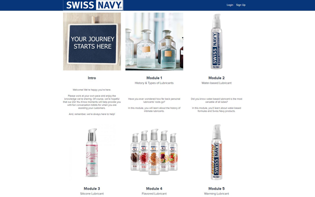 The new online Swiss Navy Certified Expert certification course is self-paced and can be accessed on multiple devices at any day and time to fit into retail staff schedules. The multi-module course is said to cover everything from types of consumable goods to in-depth knowledge of uses and solutions and is peppered with Did You Know snippets to help initiate conversations with consumers. The course was created in a bite-sized format so that retail staff can easily navigate their way to certification on any time schedule.
