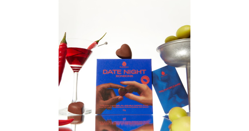 Date Night Bonbons are milk chocolate caramel bites infused with natural adaptogens including maca, ginseng, and Liboost (a concentrated damiana extract). Each box also contains 12 Truth or Dare cards to encourage play and curiosity.
