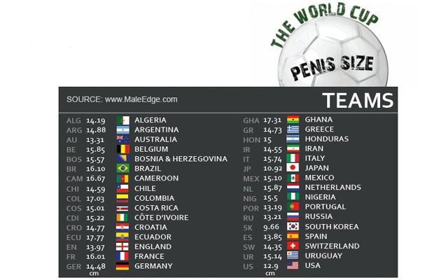 MaleEdge used the groups from the actual World Cup and paired up the matches to see who would win the trophy according to penis size. The country with the biggest average size won each match, though when the size difference was less than one centimetre the matches were counted as tied – tie breakers were settled by the concept of ‘largest wins’.