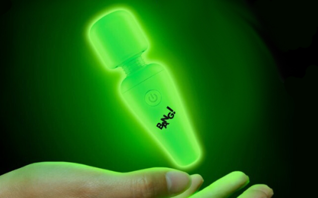 The five new glow-in-the dark vibes are a mini wand [pictured], cock ring, butt plug, anal beads, and bullet. The first three have three speeds and seven patterns of vibration, while the latter two offer four speeds and seven patterns. They are USB rechargeable and all, bar the wand, come with a remote control.